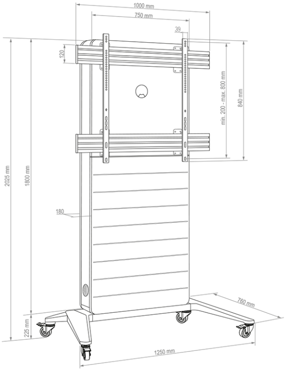 Es eignet sich für Bildschirme mit einer Diagonale von 75 bis 86“ | 191 – 218 cm. Die inkludierte VESA-Aufnahme kann bis max. VESA 900 x 800 mm bestückt werden. Die Bildschirmmontage erfolgt in Landscape-Ausrichtung.