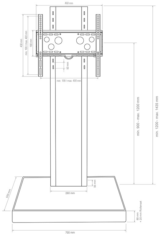 Die rückseitige Säulenabdeckung ist abnehmbar und ermöglicht komfortablen Zugang zur Verkabelung, welche im Inneren der Säule ausreichend Platz findet. Die VESA-Universalaufnahme ist bereits im Lieferumfang enthalten und kann bis max. 400 x 400 mm bestückt werden. Die VESA-Aufnahme ist optional abschließbar.